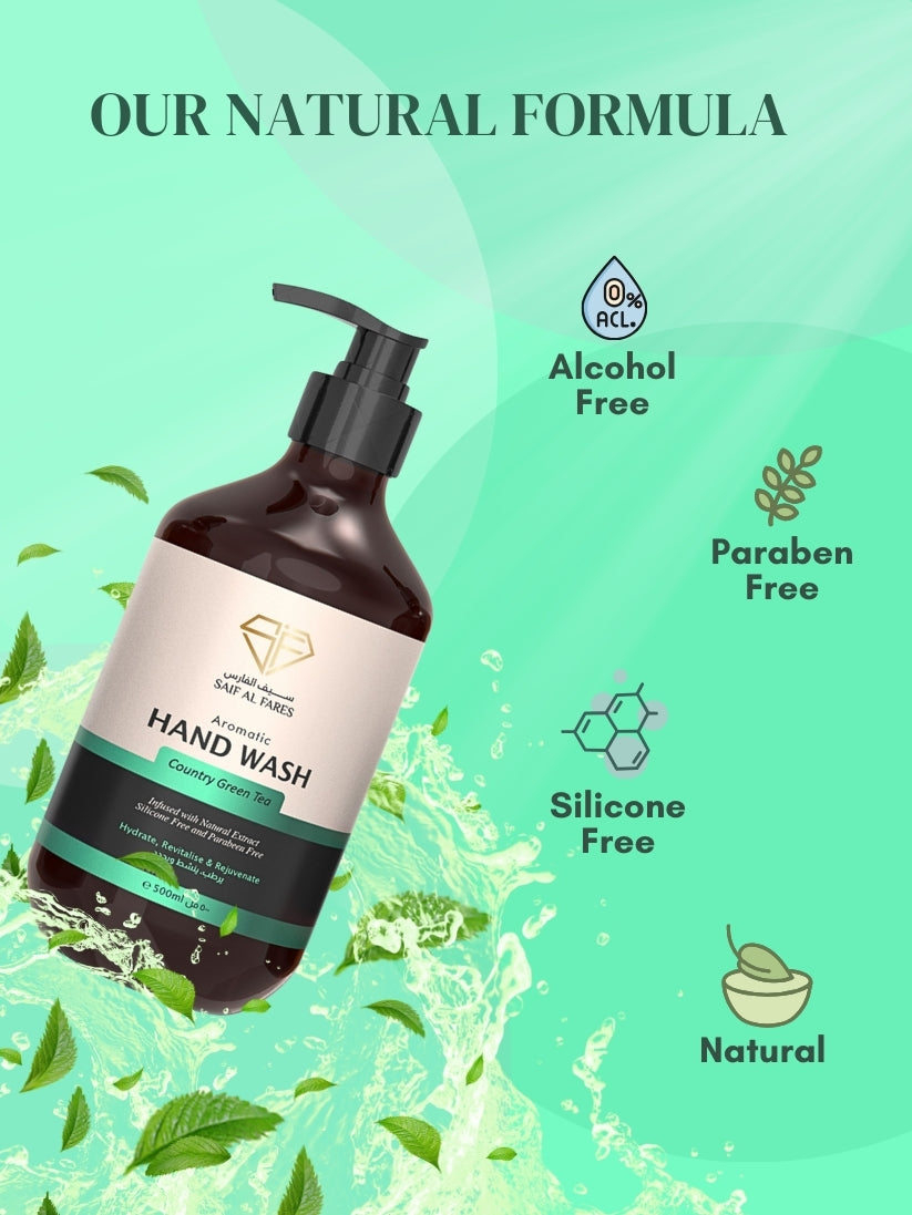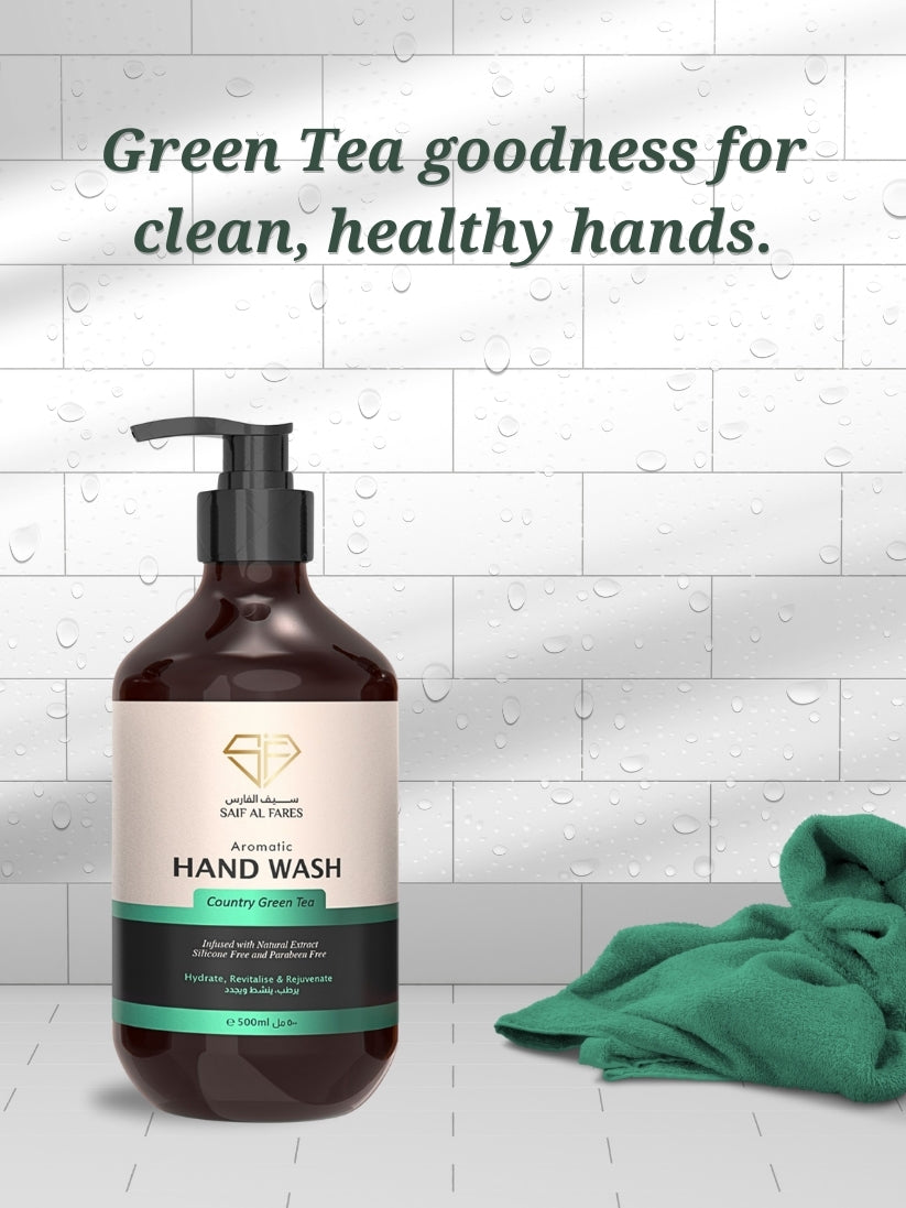 Saif Al Fares Country Green Tea Hand Wash, infused with the calming and antioxidant properties of green tea. This luxurious hand wash gently removes impurities while preserving your skin's natural moisture. The invigorating scent of green tea leaves your hands feeling clean, refreshed, and delicately scented.