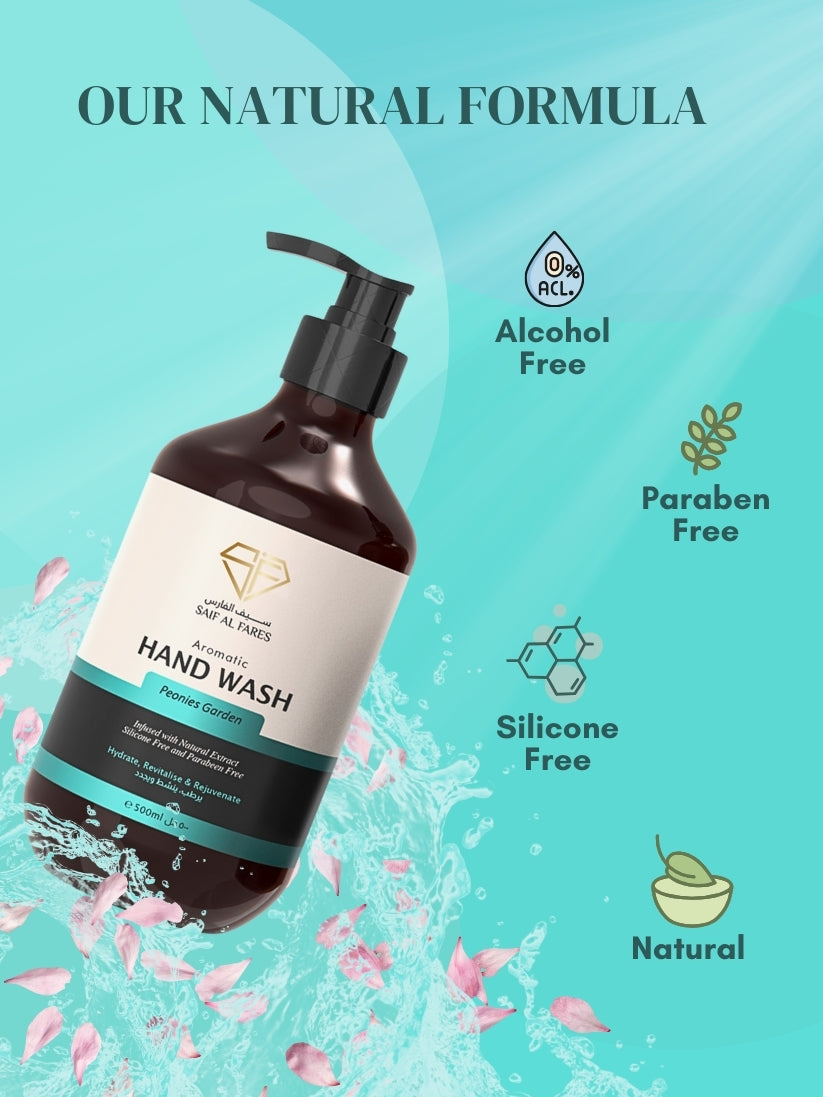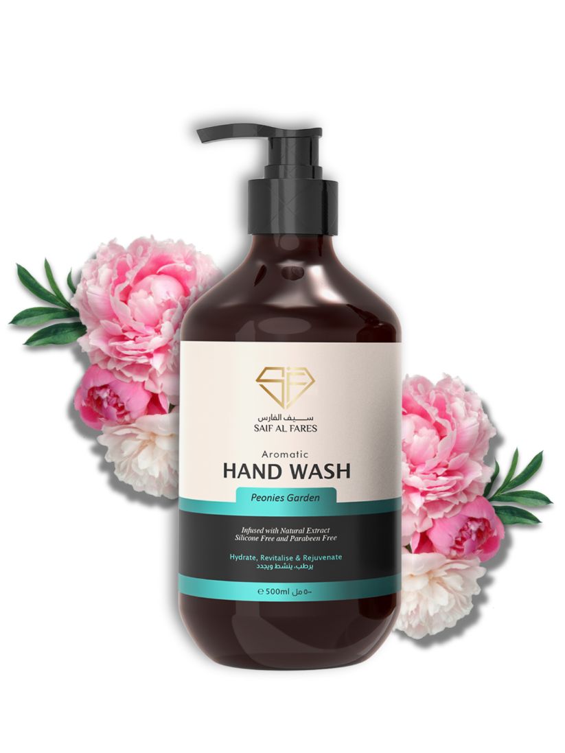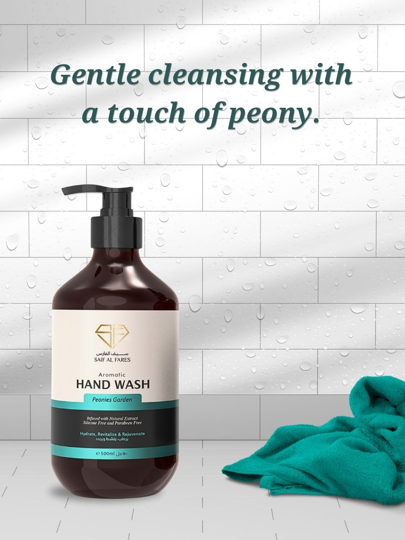 Saif Al Fares Peonies Garden Hand Wash, designed to cleanse and pamper your hands with the delicate fragrance of blooming peonies. This elegant hand wash transforms everyday hand washing into a serene experience, leaving your hands feeling soft, smooth, and beautifully scented.