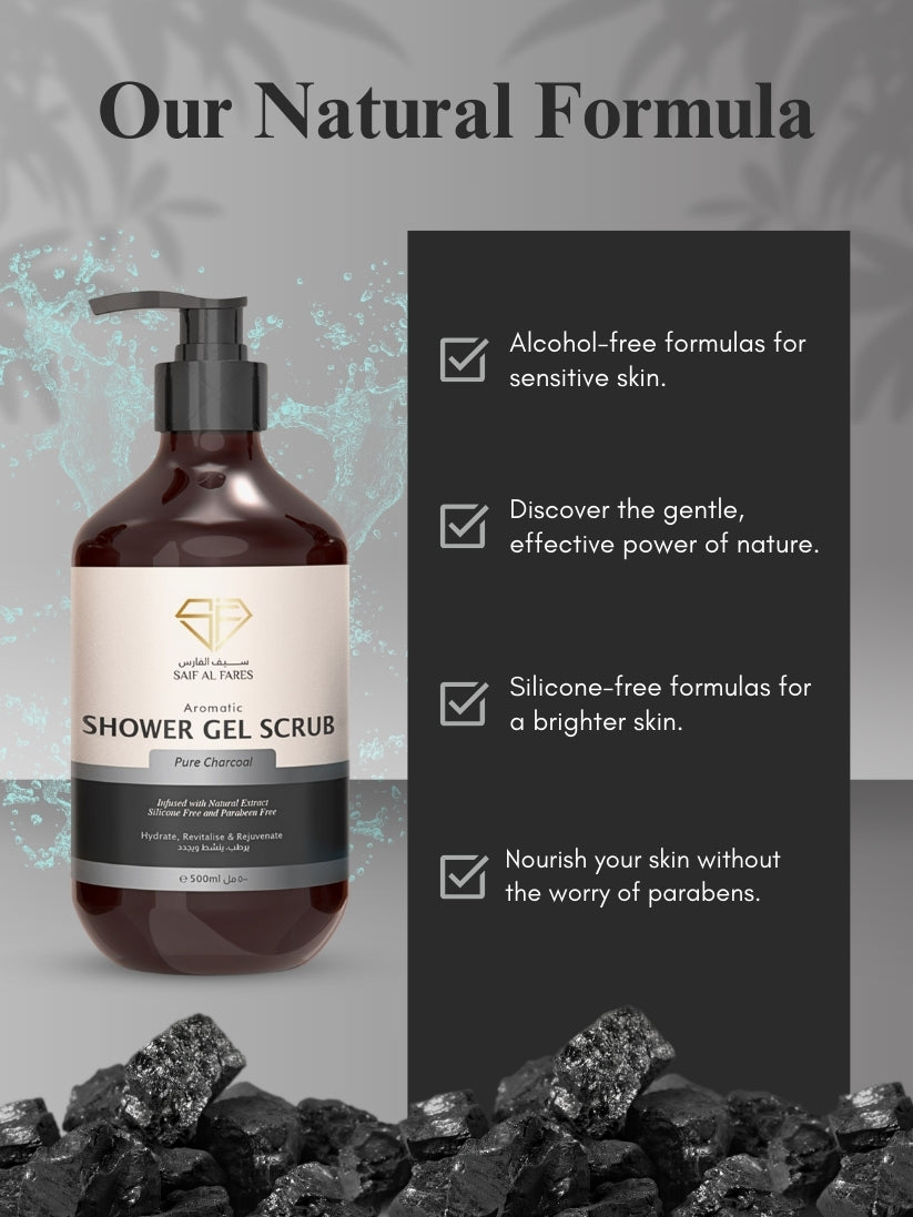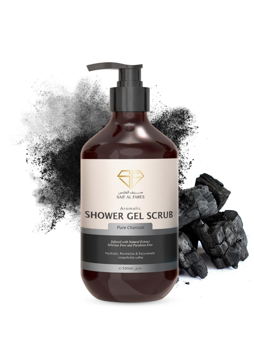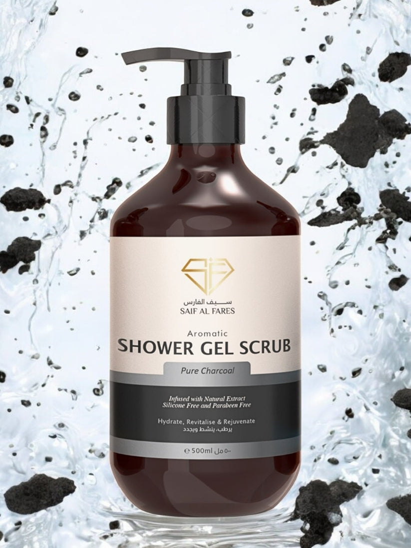 Saif Al Fares Pure Charcoal Shower Gel Scrub is an advanced exfoliating scrub combines the purifying power of charcoal with a rich, cleansing shower gel to deliver a deep, invigorating clean. Designed to detoxify and refresh, it transforms your shower routine into a spa-like experience.