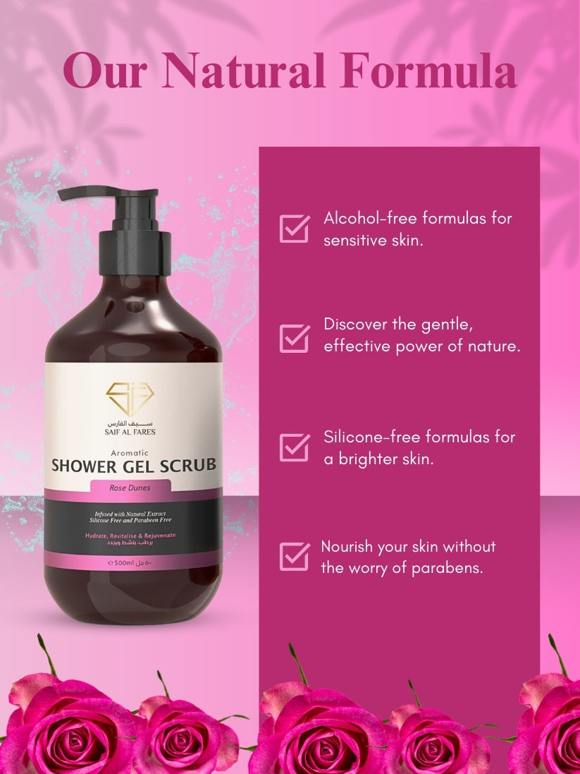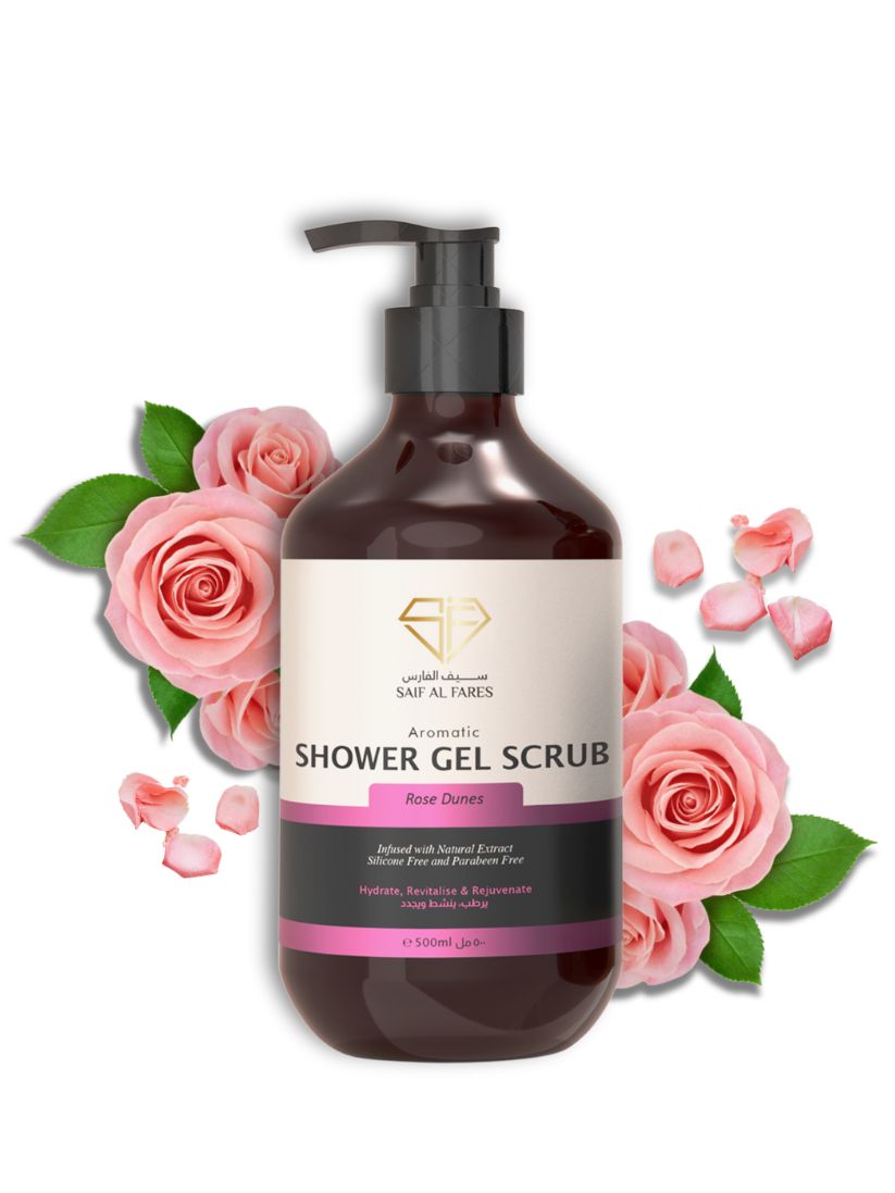 Saif Al Fares Rose Dunes Shower Gel Scrub is an exquisite shower gel scrub blends the delicate fragrance of blooming roses with the earthy warmth of desert dunes, creating a truly captivating bathing experience.
