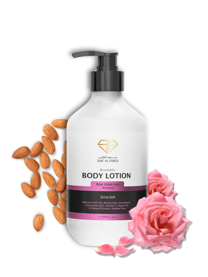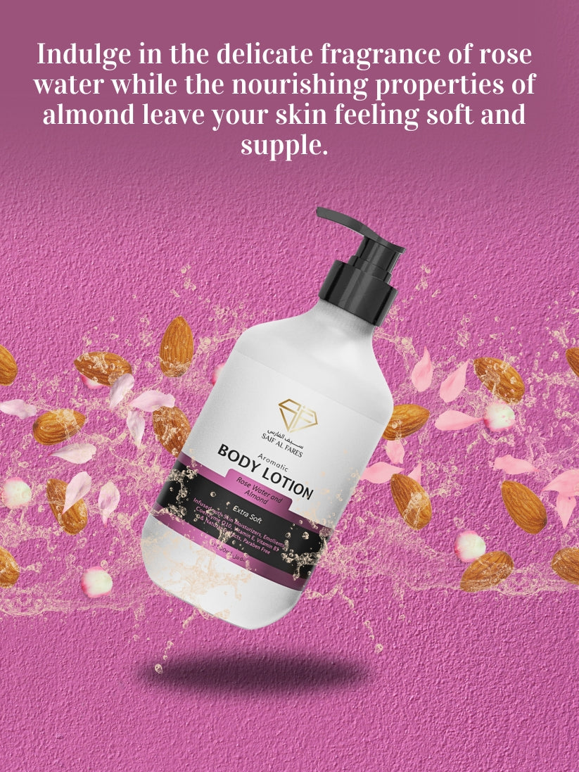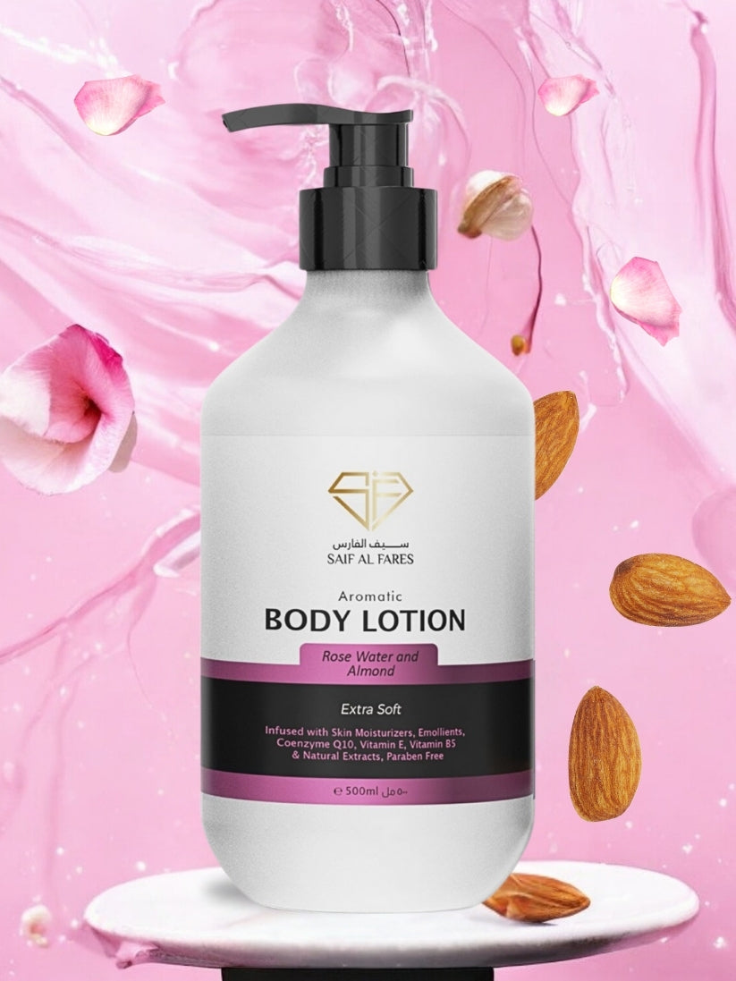 Saif Al Fares Rose Water and Almond Body Lotion, a luxurious blend that offers deep hydration and a touch of elegance. Infused with soothing rose water and nourishing almond oil, this lotion delivers a moisturizing experience that leaves your skin feeling soft, smooth, and delicately scented.