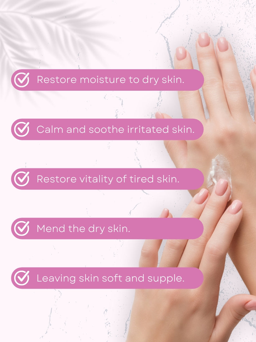 The rich formula absorbs effortlessly, providing intense moisture while calming and revitalizing your skin. Rose water helps to refresh and soothe, while almond oil deeply nourishes and smooths, enhancing your skin’s natural radiance. The light, floral aroma adds a gentle touch of luxury to your daily routine.