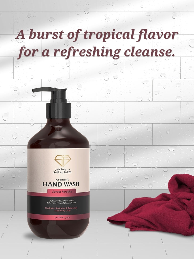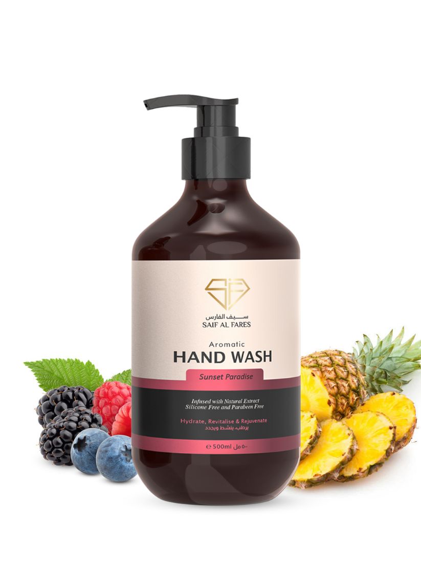 Saif Al Fares Sunset Paradise Hand Wash, this luxurious hand wash transforms your daily routine into a sensory journey, infused with a vibrant blend of exotic fruits and blooming florals. The captivating fragrance of Sunset Paradise leaves your hands feeling refreshed, clean, and subtly scented.