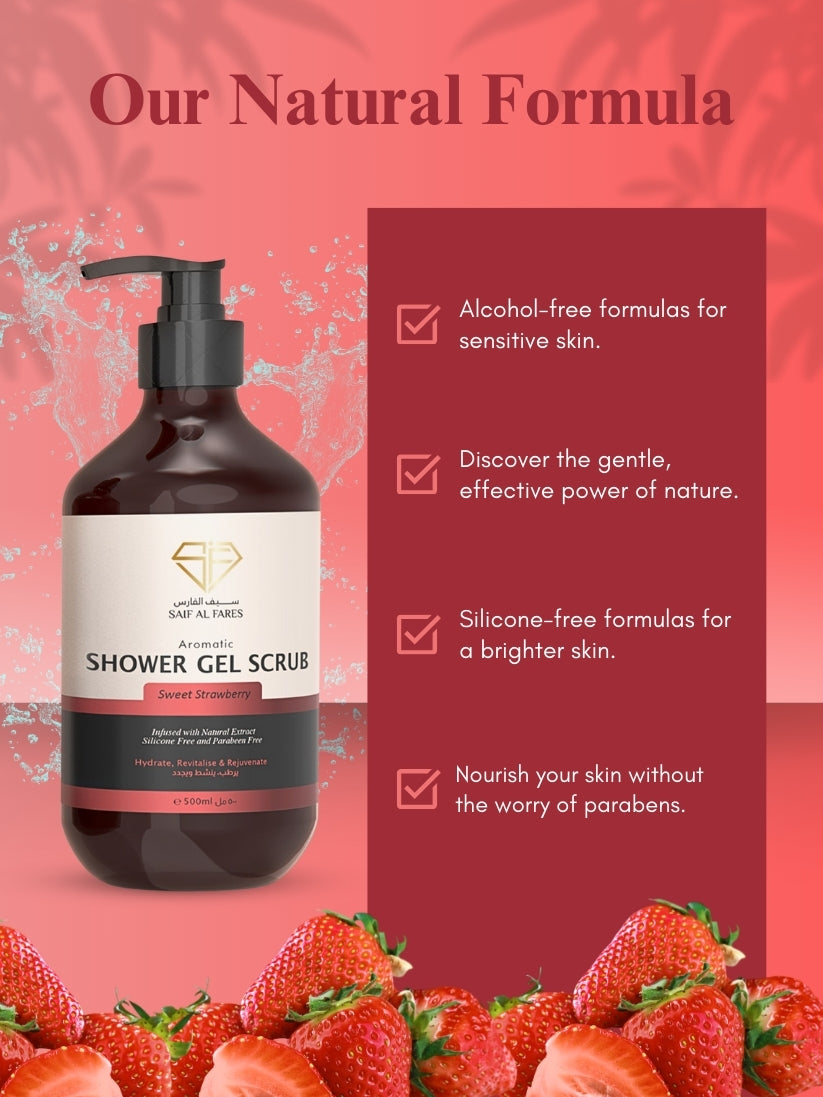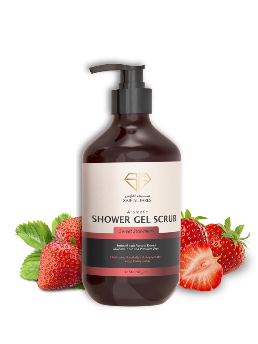 Saif Al Fares Sweet Strawberry Shower Gel Scrub is a luxurious shower gel scrub is infused with the juicy scent of ripe strawberries, bringing a burst of sweetness to your daily routine.