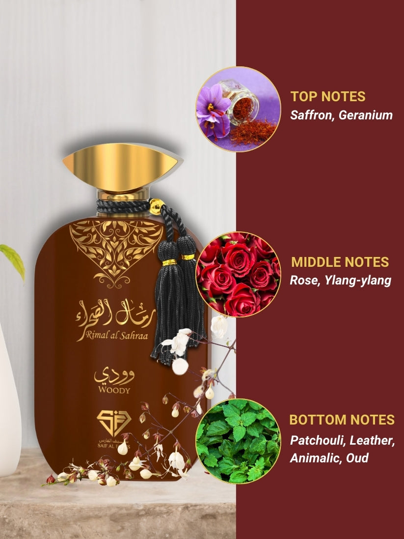 Rimal Al Saharaa Woody Acqua de Parfum scent is likely a Spicy Floral Leathery with Strong Intensity.