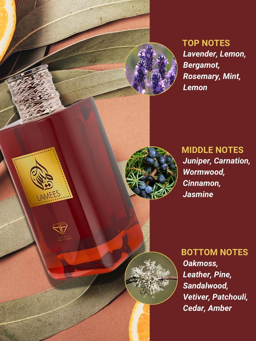 Fresh: Lavender, lemon, bergamot, lemon verbena, basil, and mint create a strong and invigorating opening with a mix of citrus and herbal freshness.