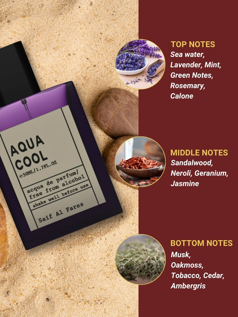 Fresh: Sea water, mint, green notes, and calone create a watery and invigorating opening. Lavender and rosemary add a touch of herbal freshness.