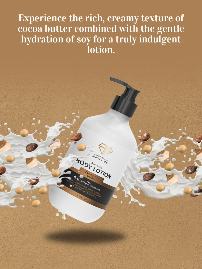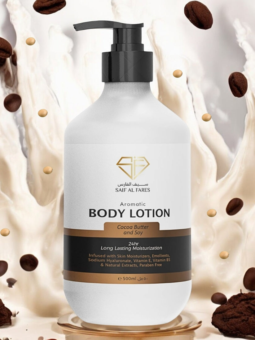 Saif Al Fares Cocoa Butter and Soy Body Lotion, this indulgent lotion blends rich cocoa butter with moisturizing soy extracts to provide your skin with intense hydration and a velvety-smooth texture. Ideal for daily use, it leaves your skin feeling soft, supple, and luxuriously moisturized.