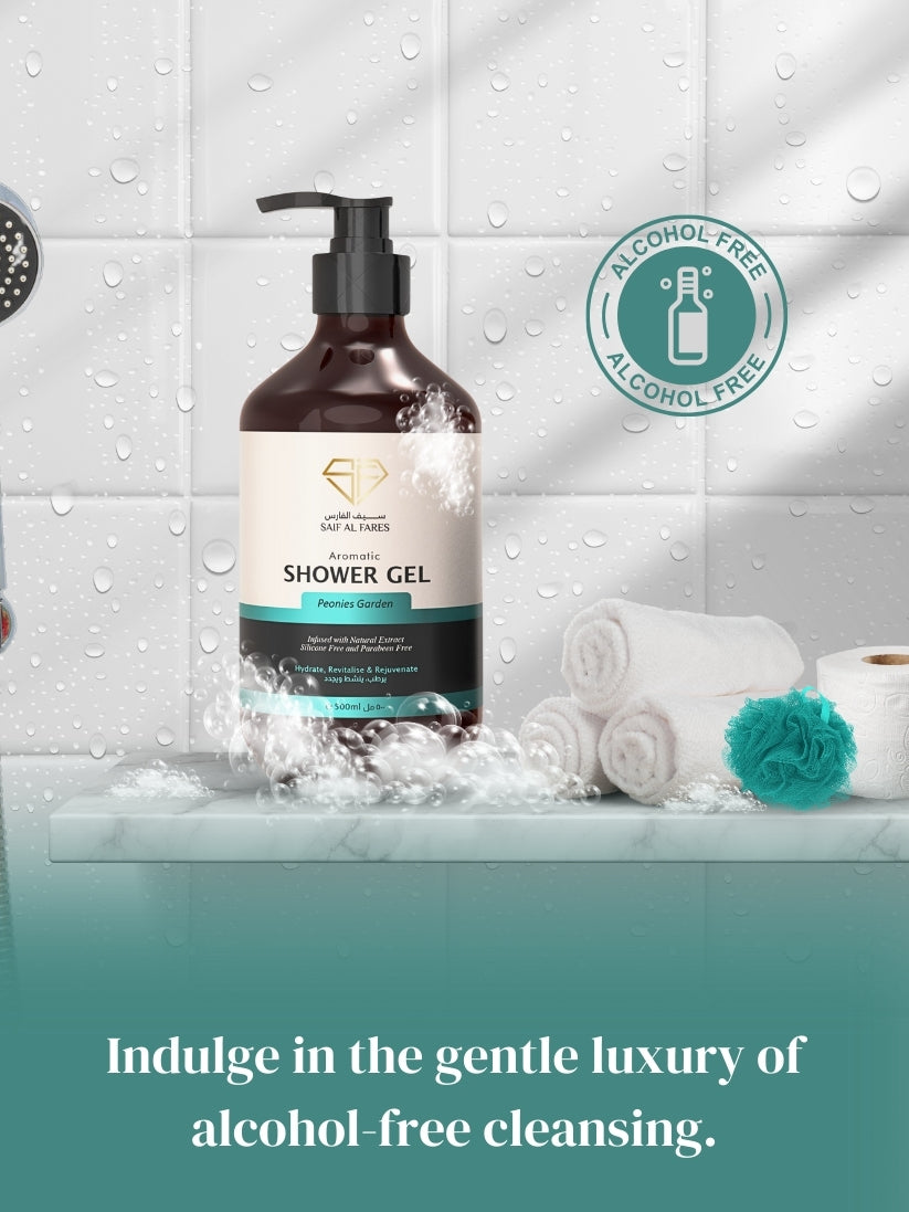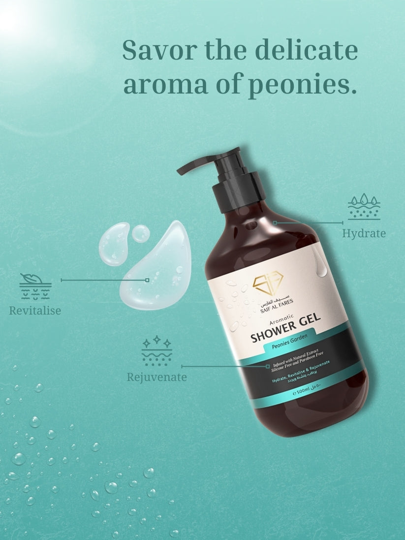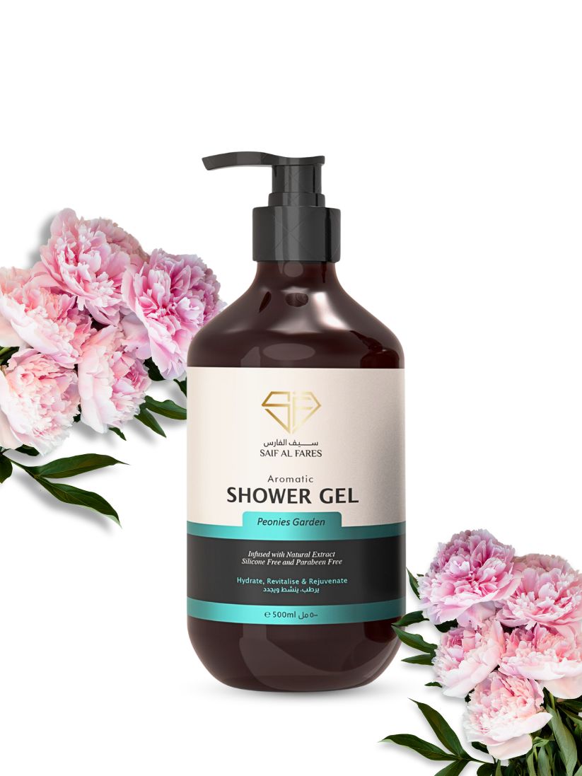 Saif Al Fares Peonies Garden Shower Gel. Infused with the delicate fragrance of peonies, this luxurious shower gel gently cleanses and revitalizes your skin, leaving it feeling soft, smooth, and beautifully scented. The rich, creamy lather creates a spa-like experience, transforming your daily shower into a moment of indulgence and relaxation.